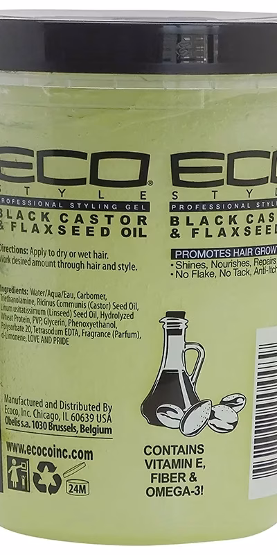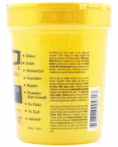 Eco Style Gold Styling Gel brings together the greatest elements of our top products. 100% pure olive oil helps moisturize your scalp, while shea butter protects every strand of hair and black castor and flaxseed oils repair and promote hair growth. Like all of our gels, Eco Style Gold will leave your hair weightless with a healthy shine and superior hold.