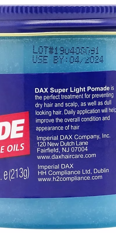 Dax pomade ingredients: Petrolatum, Paraffinum Liquidum, Lanolin, Ricinus Communis (Castor) Seed Oil, Cocos Nucifera (Coconut) Oil, Olea Europaea (Olive) Fruit Oil, Fragrance (Parfum), Yellow 11 (CI 47000), Green 6 (CI 61565), Citrus Aurantium Bergamia (Bergamot) Fruit Oil, Linalool, d-Limonene, Benzyl Benzoate. Dax edge wax ingredients: D.I Water (Aqua), Ceteareth 25, Propylene Glycol, Glycerin, Dimethicone PEG-7 Cocoate, PEG-30 Castor Oil, Phenoxyethanol, Ethylhexylglycerin, Rincus Communis (Castor) Seed Oil, Fragrance (Parfum), Coumarin, Benzyl Benzoate, FDC Yellow #5 (Cl 19140), FDC Blue #1 (Cl 42090).