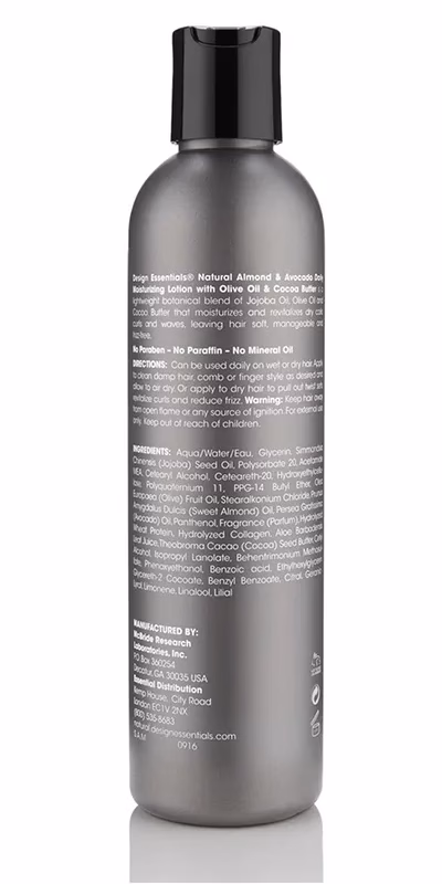 Design Essentials Almond & Avocado Natural Daily Moisturizing Lotion – lightweight blend of Jojoba Oil, Olive Oil, Cocoa Butter, and Wheat Protein has been enriched with Almond proteins and Avocado oils for increased moisture and shine. Uniquely formulated to restore hydration to the hair shaft, protect and strengthen dry, damaged hair, and sealing the cuticle to prevent breakage. Results are soft, shiny, manageable, and frizz-free noticeably healthier looking hair. Ideal for finger styling daily wash and go styles, adding shine to twist-sets, or simply rejuvenating curls and taming unwanted frizz.
