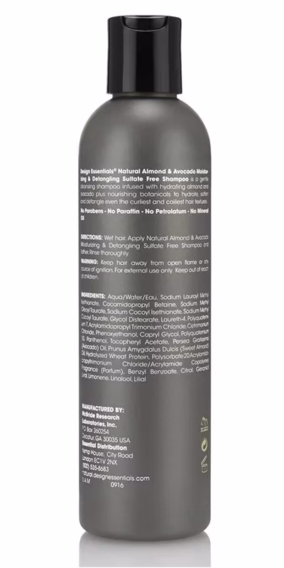 Design Essentials® Natural Almond & Avocado Moisturizing & Detangling Sulfate-Free Shampoo infused with nourishing botanicals to hydrate, soften, and detangle, is a gentle cleansing solution to rid the hair of build-up without stripping hair of natural oils. Experience a creamy lather, even on your first wash, resulting in each strand feeling soft, manageable, and noticeably hydrated.