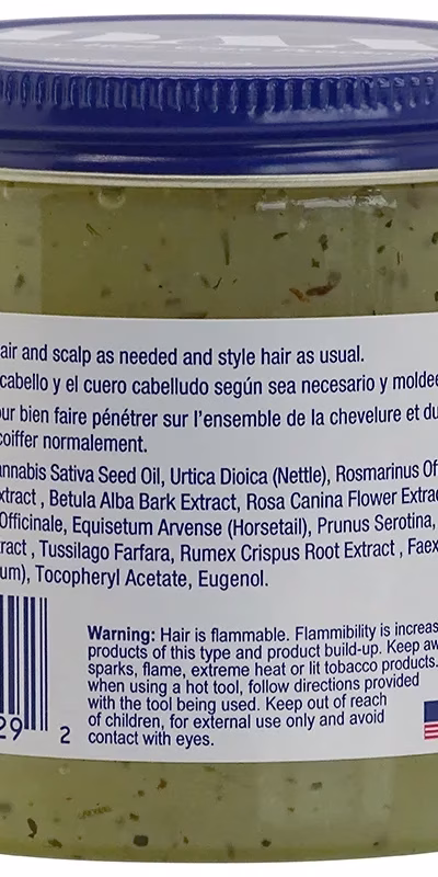 Petrolatum, Cannabis Sativa Seed Oil, Urtica Dioica (Nettle), Rosmarinus Officinalis (Rosemary) Leaf, Arctium Lappa Root Extract, Betula Alba Bark Extract, Rosa Canina Flower Extract, Chondrus Crispus (carrageenan), Taraxacum Officinale, Equisetum Arvense (Horsetail), Prunus Serotina, Echinacea Purpurea, Sambucus Nigra Flower Extract, Tussilago Farfara, Rumex Crispus Root Extract, Faex, Lanolin, Isopropyl Myristate, Propylparaben, Fragrance (Parfum), Benzyl Alcohol, Benzyl Salicylate, Coumarin, D-Limonene, Tocopheryl Acetate.