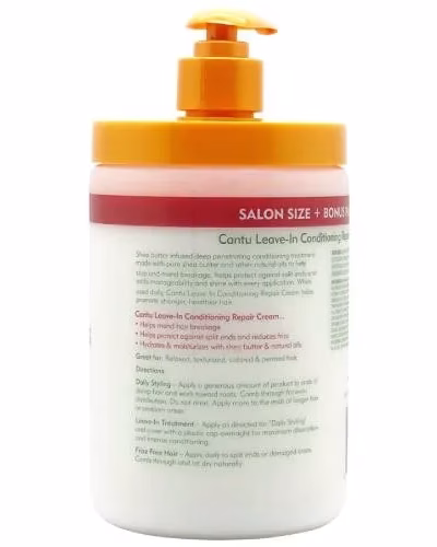 Enriched with shea butter, the deeply penetrating nourishing treatment is made with pure shea butter and other natural oils to stop and repair breaks, repair split ends, and add manageability and shine with every use. When used daily, Cantu Leave-In Conditioning Repair Cream helps promote stronger, healthier hair. Ideal for: relaxed, textured, colored and permed hair. HOW TO USE: Daily Styling – Apply a generous amount of the product to the tips of damp hair and work your way towards the roots. Comb through for even distribution. Do not rinse. Apply more to the tips of longer hair or problem areas. Leave-In Treatment – Apply as described under « Daily Styling » and cover overnight with a plastic cap for maximum absorption and intensive care. Frizz-free hair – apply daily to split ends or damaged areas. Comb through and let dry naturally.