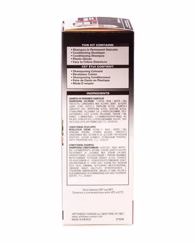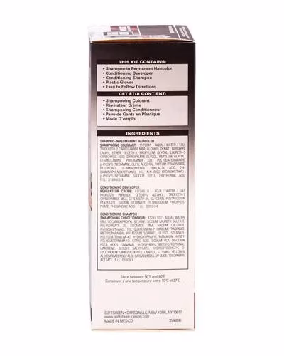 Shampooin Permanent Haircolor: 1179041 Aqua/Water/Eau, Trideceth2 Carboxamide MEA, Alcohol Denate, Glyceryl Lauryl Ether, Deceth3, Propylene Glycol, Laureth5 Carboxylic Acid, Dipropylene Glycol, Hexylene Glycol, Ethanolamine, Poloxamer 338, Polyquaternium6, PPhenylenediamine, Oleyl Alcohol, Parfum/Fragrance, Resorcinol, MAminophenol, Thiolactic Acid, 2, 4Diaminophenoxyethanol HCl, N, NBis(2Hydroxyethyl)PPhenylenediamine Sulfate, EDTA, Erythorbic Acid. Conditioner Developer: 437046 U Aqua/Water/Eau, Hydrogen Peroxide, Cetearyl Alcohol, Trideceth2 Carboxamide MEA, Ceteareth25, Glycerin, Pentasodium Pentetate, Sodium Stannate, Tetrasodium Pyrophosphate, Phosphoric Acid. Conditioning Shampoo: 42283 SS2 Aqua/Water/Eau/Cocoamidopropyl Betaine, Sodium Laureth Sulfate, Polysorbate 20, Cocamide MEA, Sodium Chloride, Phenoxyethanol, Polyquaternium7, Parfum/Fragrance, Methylparaben, Potassium Sorbate, Glycol Stearate, Polyquaternium47, Hydroxypropyl Trimonium Honey, Polyquaternium10, Citric Acid, Sodium PCA, Disodium EDTA, Hexyl Cinnamal, Butylphenyl Methylpropional, Limonene, Benzyl Salicylate, Hydroxyisohexyl 3Cyclohexene Carboxaldehyde, Linalool, CI 15985/Yellow 6, Aloe Barbadensis/Aloe Barbadensis Leaf Juice, Tocopheryl Acetate