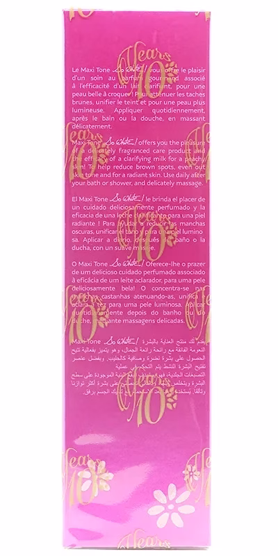 €11.99Maxi tone so white! offers you the pleasure of delicately scented care and the effectiveness of a clarifying milk for peach-colored skin. Thanks to its lightening active ingredient, it helps to control the pigmentation process, making your complexion more even and radiant than ever. Use daily after bathing or showering and massage in gently.