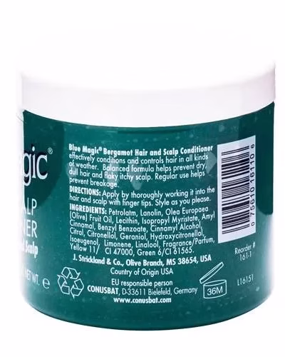 Blue Magic Bergamot Hair And Scalp ConditionerBlue Magic Bergamot Hair And Scalp Conditioner is Olive oil and lanolin enriched. Anti breakage formula Blue Magic Bergamot Hair and Scalp Conditioner effectively conditions and controls hair in all kinds of weather The balanced formula helps prevent dry, dull hair and f laky, itchy scalpr.
