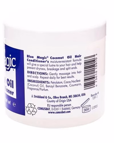 Blue Magic Conditioner Hair Dress is formulated to give effective hair conditioning for days without being greasy. Keeps hair natural and lustrous. Promotes a healthier hair and scalp condition. Use as often as you like.