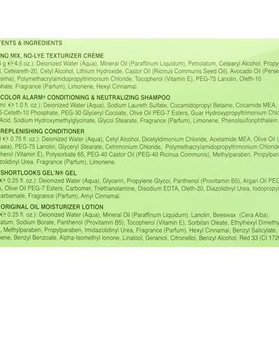 Pink No Mix, No-Lye Texturizer Creme (127.6g e 4.5 oz): Deionized Water, Mineral Oil (Paraffinum Liquidum), Petrolatum, Cetearyl Alcohol, Propylene Glycol, Ceteareth-20, Cetyl Alcohol, Lithium Hydroxide, Castor Oil (Ricinus Communis Seed Oil), Avocado Oil (Persea Gratissima), Polymethacrylamidopropyltrimonium Chloride, Tocopherol (Vitamin E), PEG-75 Lanolin, Oleth-10 Phosphate, Fragrance, Limonene, Hexyl Cinnamal Pink Color Alarm Conditioning & Neutralizing Shampoo (29.6 ml e 1.0 fl oz): Deionized Water, Sodium Laureth Sulfate, Cocamidopropyl Betaine, Cocamide Mea, PPG-5-Ceteth-10 Phosphate, PEG-30 Glyceryl Cocoate, Olive Oil PEG-7 Esters, Guar Hydroxypropyltrimonium Chloride, Citric Acid, Sodium Hydroxymethylglycinate, Glycol Stearate, Fragrance, Limonene, Phenolsulfonphthalein Pink Replenishing Conditioner (22ml e 0.75 fl oz): Deionized Water, Cetyl Alcohol, Dicetyldimonium Chloride, Acetamide Mea, Olive Oil (Olea Europaea), PEG-75 Lanolin, Glyceryl Stearate, Cetrimonium Chloride, Polymethacrylamidopropyltrimonium Chloride, Tocopherol (Vitamin E), Polysorbate 60, PEG-40 Castor Oil (PEG-40 Ricinus Communis), Methylparaben, Propylparaben, Imidazolidinyl Urea, Fragrance, Limonene Pink Shortlooks Gel’n Gel (7ml e 0.25 fl oz): Deionized Water, Glycerin, Propylene Glycol, Panthenol (Provitamin B5), Argan Oil PEG-8 Esters, Olive Oil PEG-7 Esters, Carbomer, Triethanolamine, Disodium EDTA, Oleth-20, Diazolidinyl Urea, Iodopropynyl Butylcarbamate, Fragrance, Amyl Cinnamal Pink Original Oil Moisturizer Lotion (7ml e 0.25 fl oz): Deionized Water (Aqua), Mineral Oil (Paraffinum Liquidum), Lanolin, Beeswax (Cera Alba), Petrolatum, Sodium Borate, Panthenol (Provitamin B5), Tocopherol (Vitamin E), Sorbitan Oleate, Ethylhexyl Dimethyl PABA, Methylparaben, Propylparaben, Imidazolidinyl Urea, Fragrance, Hexyl Cinnamal, Benzyl Salicylate, Limonene, Benzyl Benzoate, Alpha-Isomethyl Ionone, Linalool, Geraniol, Citronellol, Benzyl Alcohol, Red 33 (CI 17200)
