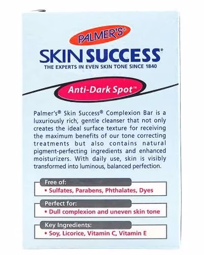 Palmer’s Skin Success Eventone Complexion S oap, a unique complexion bar, is specially formulated to leave skin thoroughly c lean without overdrying. Enriched with Vitamin E, it helps eliminate clogg ed pores that can lead to blemishes.