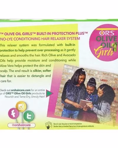 Organic Root Stimulator Olive Oil Girls Relaxer is developed for younger girl s. The new Organic Root Stimulator Olive Oil Girls Built-in Protection Plus No-L ye Conditioning Relaxer System is targeted to moms of tween (10-plus) girls and the top panel of the box is designed to communicate to moms the key features and benefits. The system is infused with aloevera to help protect skin and scalp, avocado to help restore moisture, wheat proteins to help prevent over-processing of previously relaxed hair, and olive oil to provide sheen and heat protection.