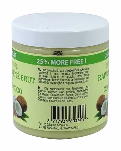 The raw shea butter and coconut oil are a natural, versatile one, obtained from the nuts of the shea tree that grows in the savannah area. The shea tree is also known as the « tree of life » because almost all parts of the tree have special properties such as: 100% certified organic Contains only one ingredient that is free of synthetic fragrances, colors or preservatives. Helps with various skin conditions. Provides sun protection. Promotes hair growth and hair quality. Stimulates cell renewal in the skin.