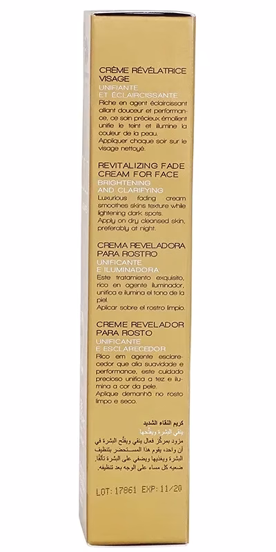 Luxurious fade cream smoothes the structure of the skin and aggressively brightens dark spots. The skin gets a healthy glow. Vitamins A, C and E provide antioxidant protection. Soft, fruity fragrance. Paraben free. Dermatologist approved. Application: For best results, apply the Fade Cream preferably at night to dry, cleansed skin on the face or body. Let dry. Avoid the eye area. Apply sunscreen with at least SPF 50 every morning to keep your skin tone even.
