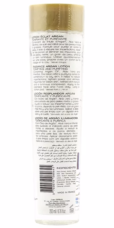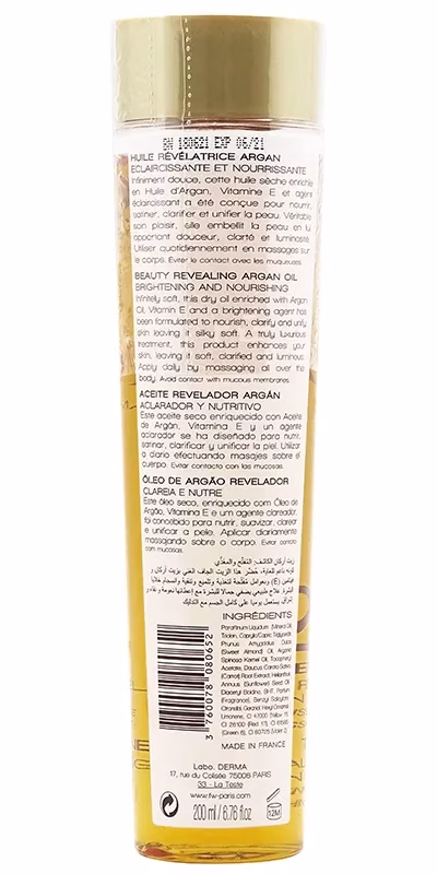 An infinitely soft drying oil … -Enriched with argan oil, vitamin E and a brightener. -Formulated to nourish, clarify and unify the skin and make it silky soft -A truly luxurious care that beautifies your skin, leaving it soft, clarified and radiant. Main Ingredients: Sweet Almond Oil, Vitamin « E », Sunflower Oil and Diacetyl Boldine.