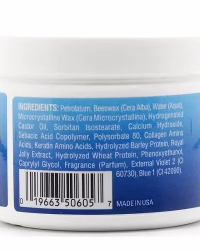 Ingredients: Water (Aqua), Mineral Oil (Paraffinum Liquidum), Beeswax (Cera Alba), Propylene Glycol, Petrolatum, DEA Oleth-10 Phosphate, DEA Oleth-3 Phosphate, PEG-30 Castor Oil, Oleth-5, VP / VA Copolymer, Oleth-3, Sodium Borate, Diazolidinyl Urea, Methylparaben, Propylparaben, Collagen Amino Acids, Keratin Amino Acids, Hydrolyzed Barley Protein, Hydrolyzed Royal Jelly, Hydrolyzed Yeast Protein, Fragrance (Parfum), Ext.Violet 2 (CI 60730), Blue 1 (CI 42090).