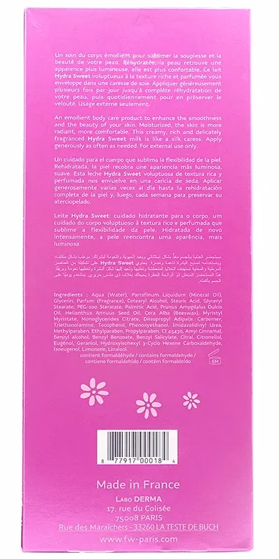 Messe & Weiß So WeißSweet moisturizing body care milk is an exceptionally nourishing body care product that improves the smoothness and vitality of your skin: it is intensely moisturized, making it smoother and more radiant. The moisturizing and nourishing active ingredients of Hydra Sweet target, nourish and structure your thirsty cells and thus restore the softness and radiance of your skin. This creamy, rich and delicately fragrant milk is like a silk caress.