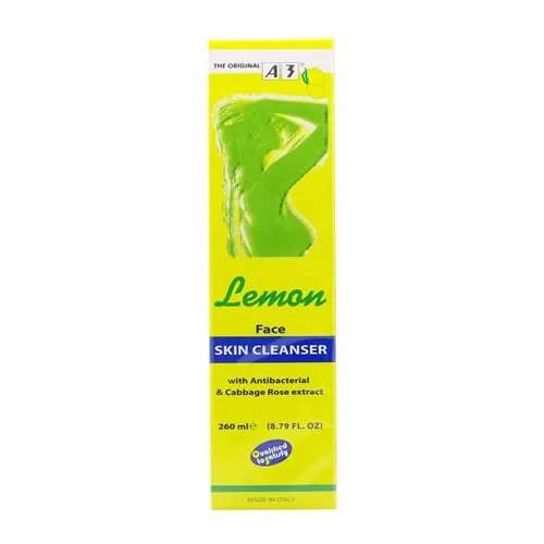 A3 Lemon Face Skin Cleanser Dermopurifying Formula to remove the origin (exc ess of sebum) of pimples and black heads (pore occlusion). The Lemon Face Skin C leanser helps to prevent the formation of these slight blemishes and, thanks to the addition of Cabbage Rose Extract, the skin shall look fresh and soft.