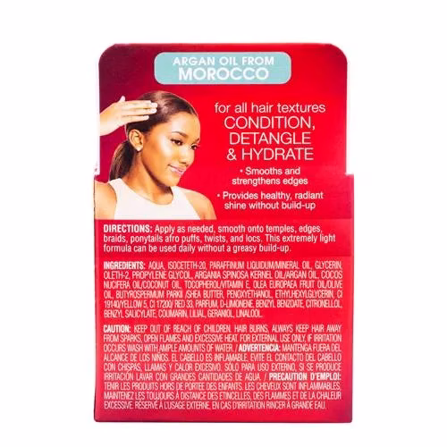 Smooth, strengthen and shine with the power of pure Moroccan argan oil. Moisture and shiny edges give your edges a smooth finish, strengthen them and ensure a healthy, radiant shine without deposits. Apply to temples, edges, braids, ponytails, twists and locs as needed. This extremely light formula can be used daily without any greasy deposits.