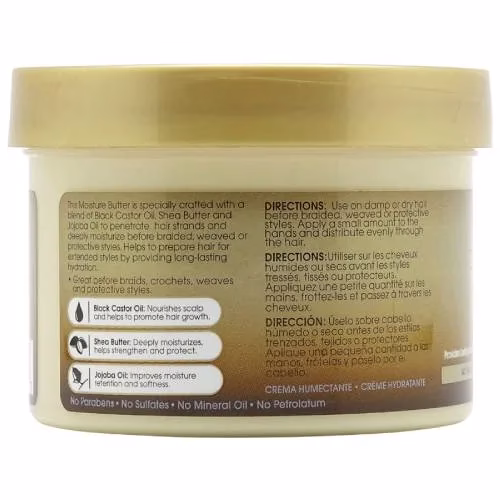 This Moisture Butter is specially crafted with a blend of Black Castor Oil, Shea Butter and Jojoba Oil to penetrate hair strands and deeply moisturize before braided, weaved or protective styles. Helps to prepare hair for extended styles by providing long-lasting hydration. Great before braids, crochets, weaves and protective styles.