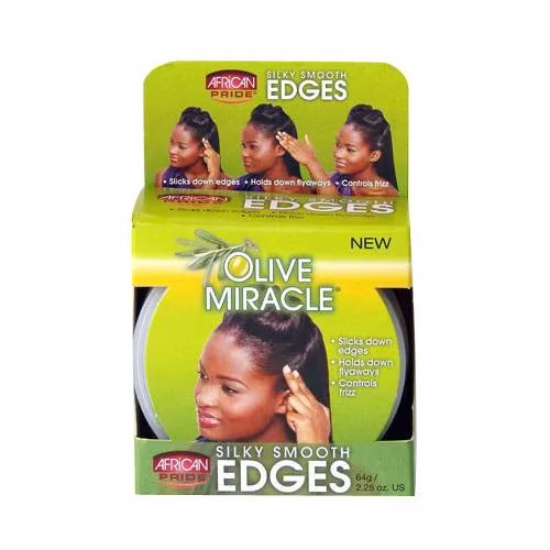 Miracle Silky Smooth Edges Hedgehog is enriched with extra virgin olive oil to achieve the highest level of silky smooth edges, ponytails and braids. African Pride Olive Miracle Silky Smooth Edges is ideal for straight or natural slick look styles