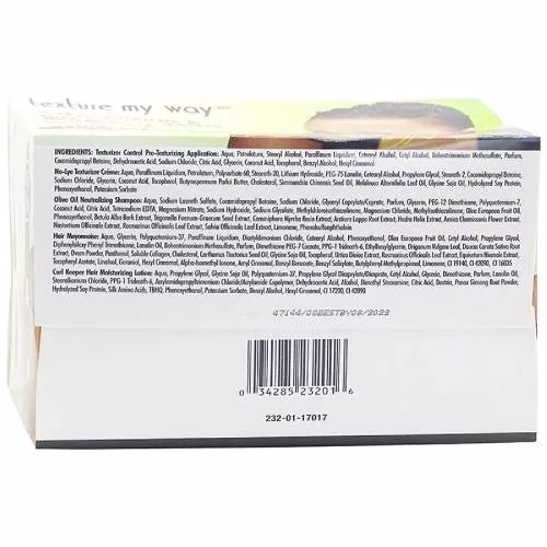 Texturizer Control Pre-Texturizing Application: Aqua, Petrolatum, Stearyl Alcohol, Paraffinum Liquidum, Cetearyl Alcohol, Cetyl Alcohol, Behentrimonium Methosulfate, Parfum, Cocamidopropyl Betaine, Dehydroacetic Acid, Sodium Chloride, Citric Acid, Glycerin, Coconut Acid, Tocopherol, Benzyl Alcohol, Hexyl Cinnamal. No-Lye Texturizer Creme: Aqua, Paraffinum Liquidum, Petrolatum, Polysorbate-60, Steareth-20, Lithium Hydroxide, PEG-75 Lanolin, Cetearyl Alcohol, Propylene Glycol, Steareth-2, Cocamidopropyl Betaine, Sodium Chloride, Glycerin, Coconut Acid, Tocopherol, Butyrospermum Parkii Butter, Cholesterol, Simmondsia Chinensis Seed Oil, Melaleuca Alternifolia Leaf Oil, Glycine Soy Oil, Hydrolyzed Soy Protein, Phenoxyethanol, Potassium Sorbate. Olive Oil Neutralizing Shampoo: Aqua, Sodium Laureth Sulfate, Cocamidopropyl Betaine, Sodium Chloride, Glyceryl Caprylate/Caprate, Parfum, Glycerin, PEG-12 Dimethicone, Polyquaternium-7, Coconut Acid, Citric Acid, Tetrasodium EDTA, Magnesium Nitrate, Sodium Hydroxide, Sodium Glycolate, Methylchloroisothiazolinone, Magnesium Chloride, Methylisothiazolinone, Olea Europaea Fruit Oil, Phenoxyethanol, Betula Alba Bark Extract, Trigonella Foenum-graecum Seed Extract, Commiphora Myrrha Resin Extract, Arctium Lappa Root Extract, Hedera Helix Extract Arnica Chamissonis Flower Extract, Nasturtium Officinale Extract, Rosmarinus Officinalis Leaf Extract, Salvia Officinalis Leaf Extract, Limonene, Phenolsulfonphthalein. Hair Mayonnaise: Aqua, Glycerin, Polyquaternium-37, Paraffinum Liquidum, Dicetyldimonium Chloride, Cetearyl Alcohol, Phenoxyethanol, Olea Europaea Fruit Oil, Cetyl Alcohol, Propylene Glycol, Diphenylsiloxy Phenyl Trimethicone, Lanolin Oil, Behentrimonium Methosulfate, Parfum, Dimethicone PEG-7 Cocoate, PPG-1 Trideceth-6, Ethylhexylglycerin, Origanum Vulgare Leaf, Dams Carole Saliva Root Extract, Ovum Powder, Panthenol, Soluble Collagen, Cholesterol, Carthamus Tinctorius Seed Oil, Glycine Soja Oil, Tocopherol, Urtica Dioica Extract, Rosmarinus Officinalis Leaf Extract, Equisetum Hiemale Extract, Tocopheryl Acetate, Linalool, Geraniol, Hexyl Gnome!, Alpha-Isomethyl lonone, Amyl Cinnamal, Benzyl Benzoate, Benzyl Salicylate, Butylphenyl Methylpropional, Limonene, CI 19140, CI 42090, CI 16035. Curl Keeper Hair Moisturizing Lotion: Aqua, Propylene Glycol, Glycine Soja Oil, Polyquaternium-37, Propylene Glycol Dicaprylate/Dicaprate, Cetyl Alcohol, Glycerin, Dimethicone, Parfum, Lanolin Oil, Stearalkonium Chloride, PPG-1 Trideceth-6, Acrylamidopropyltrimonium Chloride/Acrylamide Copolymer, Dehydroacetic Acid, Alcohol, Dimethyl Stearamine, Citric Acid, Dextrin, Panax Ginseng Root Powder, Hydrolyzed Soy Protein, Silk Amino Acids, TBHQ, Phenoxyethanol, Potassium Sorbate, Benzyl Alcohol, Hexyl Cinnamal, CI 17200, CI 42090.