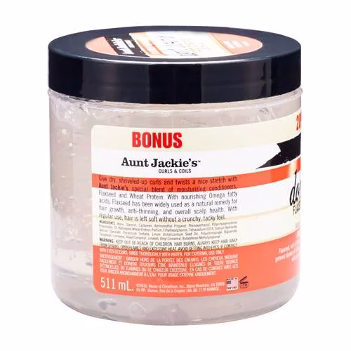 Give dry, shriveled up curls and twists a nice stretch with Aunt Jackie’s special blend of moisturizing conditioners, Flaxseed, Shea Butter and Extra Virgin Olive Oil. With nourishing Omega-3 fatty acids, Flaxseed has been widely used as a natural remedy for hair growth, anti-thinning, and overall scalp health. With regular use, hair is left soft without a crunchy, tacky feel. This Curl Gel is is sulfate-free, paraben-free and does not contain mineral oil or petrolatum.