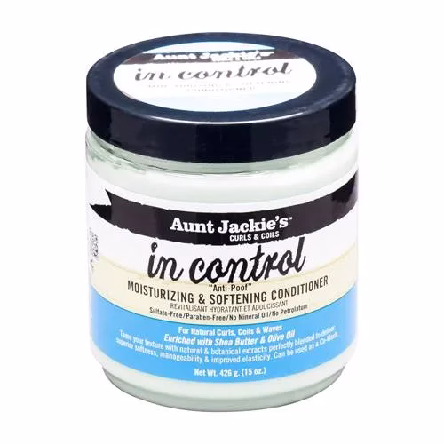 Aunt Jackies In Control Moisturizing and Softening Conditioner For amazing softness, deep conditioning and greater manageability use Aunt Jackies in control as often as needed. Perfect as a restorative and reconstructive conditioning treatment, or as a co wash, in control gives vibrancy to dehydrated, brittle, dill, and dry looking hair and softens for easier combing and styling.