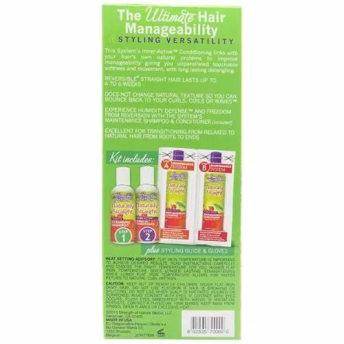 This system allows you to go from curly to straight styles, without harsh chemicals and without permanently changing your natural hair texture. Go back and forth between natural and straight styles with unparalleled touchable softness, movement and shine. Reversible straightening lasts up to 4 to 6weeks and the maintenance system (included) defends against reversion, fighting humidity so straight styles last longer. This system’s revolutionary Inner-Active conditioning gives the highest level of moisturizing that you have ever experienced. Use the system’s maintenance shampoo and conditioner (included) designed to preserve the Inner-Active conditioning that keeps straight styles humidity proof and resistant.