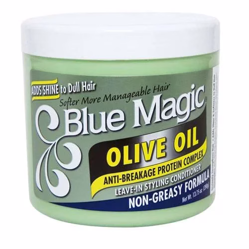 Blue Magic Olive Oil Styling Leave in Conditioner. Instantly strengthens hair. Adds shine and softness to dull hair. Dry hair repair. Softer more manageable hair. Anti-breakage protein complex. Non-greasy formula