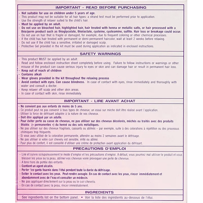 HAIR and SCALP PROTECTOR GEL / GEL PROTECTEUR: 42211 SS1 – PARAFFINUM LIQUIDUM / MINERAL OIL / HUILE MINERALE, DIETHYLHEXYL MALEATE, HYDROGENATED STYRENE / ISOPRENE COPOLYMER, ISOPROPYLEC-RISTO, ISOPROPYLECRISTOEDER, ISOPROPYLECRISTO, ISOPROPYLECRISTO-1, ISOPROPYLECRISTO, ISOPROPYLECRISTO-1,3-OCT / COCONUTOIL, BUTYROSPERMUM PARKII BUTTER / SHEA BUTTER, ISOPROPYL PALMITATE, ALOE BARBADENSIS EXTRACT / ALOE BARBADENSIS LEAF EXTRACT. FIL D159050 / 1 NO-MISTAKE RELAXER CREAM / CRÈME DEFRISANTE: 42420 SS7 -AQUA / WATER / EAU, PETROLATUM, PARAFFINUM LIQUIDUM / MINERAL OIL / HUILE MINERALE, CETEARYL ALCOHOL, GUANIDINE CARBONATE, POLISH, PEG-6HOLINE, METYENTROLATE, PEG-6H , PERFUME / FRAGRANCE, COCAMIDOPROPYLBETAINE, COCOS NUCIFERAOIL / COCONUTOIL, PROPYLENE GLYCOL, BUTYROSPERMUM PARKIIBUTTER / SHEA BUTTER, ISOPROPYL MYRISTATE, CI, ISOPROPYL 4, 15510 / ORANGE, CI, ISOPROPYL PALMITATE DENATONIUM BENZOATE, ALOE BARBADENSIS EXTRACT / ALOE BARBADENSIS LEAF EXTRACT. FIL 0160271/1 NO-MISTAKE CREAM ACTIVATOR / ACTIVATEUR CRÈME: 42462 SS1 – PROPYLENE GLYCOL, CALCIUM HYDROXIDE, SILICA, CI 77891 / TITANIUM DIOXIDE. FIL 044641/2 COLOR SIGNAL NEUTRALIZING SHAMPOO / SHAMPOOING NEUTRALIZANT: 42453 SS7 – AQUA / WATER / EAU, SODIUM LAURETH SULFATE, POLYSORBATE 21, PPG-5-CETETH-10 PHOSPHATE, COCAMIDOPROPYL, POLYSORBATE 20, POLYSORBATE, COCAMIDOPROPY, COCAMIDOPROPYLBETAINE, COCAMIDOPROPYLBETAINE, COCAMIDOPROPYLBETAINE 20, COCAMIDOPROPYLBETAINE. FRAGRANCE, SODIUM CHLORIDE, HEXYLENE GLYCOL, SODIUM HYDROXIDE, ALOE BARBADENSIS / ALOE BARBADENSIS LEAFJUICE, COCOS NUCIFERA OIL / COCONUT OIL, BUTYROSPERMUM PARKII BUTTERIUM, SODIUM HYDROXIDE, PHRO, HYDROSPERMUM, SODIUM HYDROXID, SODIUM BUTTER, PHRO, HYDALE FIL 0161486/1 DEEP CONDITIONER / SOIN HYDRATATION INTENSE: 42889 SS7 – AQUA / WATER / EAU, PROPYLENE GLYCOL, CETEARYL ALCOHOL, POLYQUATERNIUM-37, PROPYLENE GLYCOL DICAPRYLATE / DICAPRATE, BEHENTRIMONIUM METHOSULFATE, PERFUME / FRAGRANCE, SODIUM BENZOATE, PHENOXONEYETHANOL, ALUCECYETHANOL, BARBECAENOATE, BARBECOURA, BARBECUE-6, ALUCECETHANOL, BARBECAETHANOL, BARBECAETH-6 COCONUT OIL, BUTYROSPERMUM PARKII BUTTER / SHEA BUTTER, CHLORHEXIDINE DIHYDROCHLORIDE, 2-0LEAMIDO-1,3-0CTADECANEDIOL. FIL D159283 / 1 CONDITIONING OIL MOISTURIZER / CONDITIONNEMENT DE L’HYDRATANT: 42887 SS8 – AQUA / WATER / EAU, PARAFFINUM LIQUIDUM / MINERAL OIL / HUILE MINERALE, GLYCERIN PETROLATUM, CETEARYLINA ALCOHROXCRIST / WAXCRIST, CERA 100 STEARATE, GLYCERYL STEARATE, PHENOXYETHANOL, PERFUME / FRAGRANCE, POLYSORBATE 60, XANTHAN GUM, CAPRYLYL GLYCOL, ALOE BARBADENSIS / ALOE BARBADENSIS LEAF JUICE, COCOS NUCIFERA OIL / COCONUT OIL, BUTYROSPERMUM PARKII BUTTER / SHEA BUTTER, VP / DIMETHYLAMINOETHYLMETHACRYLATE COPOLYMER. FIL D159814 / 1