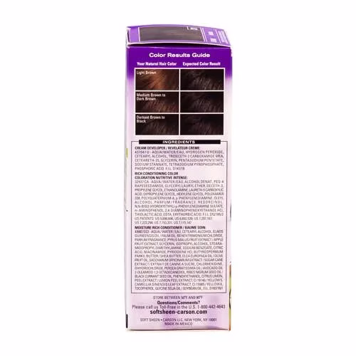 Cream Developer: 437047 Uwater, hydrogen peroxide, cetearyl alcohol, trideceth2 carboxamide MEA, ceteareth25, glycerin, pentasodium pentetate, sodium stannate, tetrasodium pyrophosphate, FIL D141 / 10. Rich Conditioning Color: 32718 CAWater, trideceth2 carboxamide MEA, alcohol denat., Glyceryl lauryl ether, deceth3, propylene glycol, ethanolamine, pPhenylenediamine, oleyl alcohol, frangrance, 2,4diaminophenoxyethanol HCI, resorcinol, thiolactic acid, EDTA, polyqminopernium24, mA , NBIS (2hydroxyethyl) pPhenylenediamine sulfate, Erythorbic acid, FIL D27082 / 1. Moisture Rich Conditioner: 42497 SS2water, cyclopentasiloxane, cetearyl alcohol, candelilla cera / candelilla wax, dimethiconol, polyquaternium37, paraffinum liquidum / mineral oil, glycerin, cetyl esters, peg150 / stearyl alcohol / SMDI copolymer, fragrance, methylparaben, ppg1 trideceth