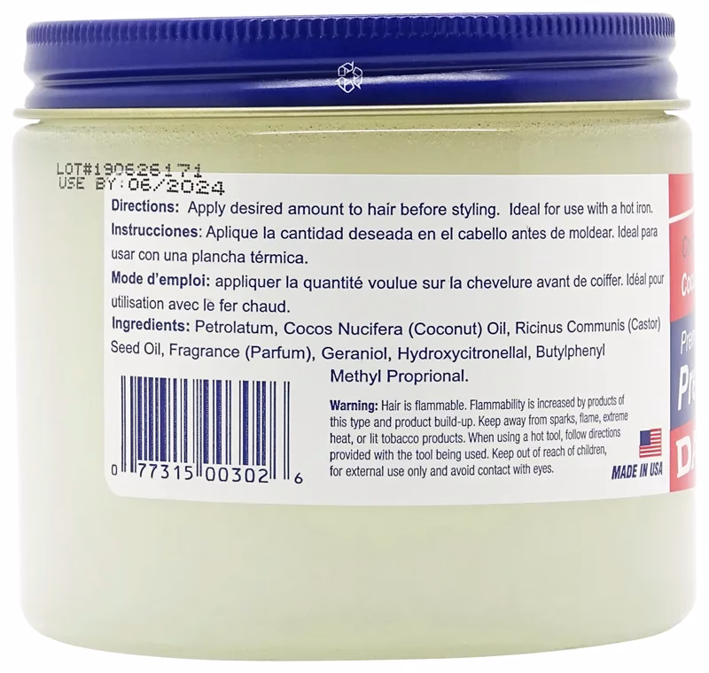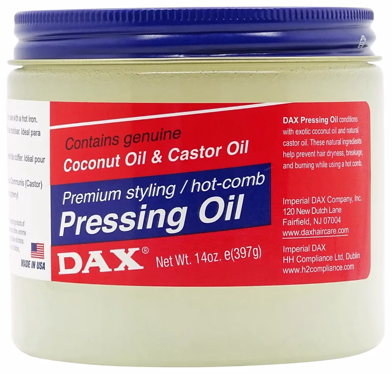 DAX Pressing Oil is a soft, nourishing pomade with petroleum jelly, coconut oil, castor oil and a mild coconut scent. The DAX Pressing Oil protects the hair from drying out and burning with a flat iron or a curling iron. The natural oils also prevent hair breakage and help with split ends.