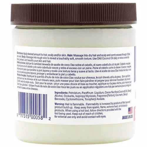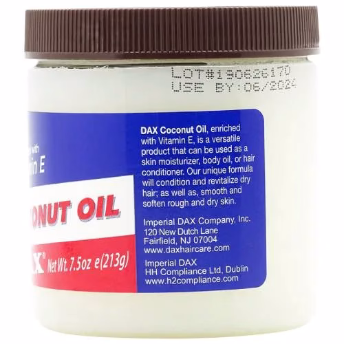 DAX Coconut Oil enriched with Vitamin E, is a versatile product that can be u sed as a skin moisturizer, body oil, or hair conditioner. Our unique formula wil l condition and revitalize dry hair; as well as, smooth and soften rough and dry skin.
