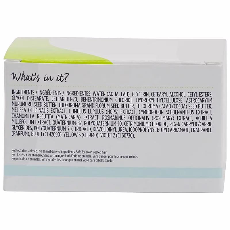 Water (Aqua), Glycerin, Cetearyl Alcohol, Cetyl Esters, Glycol Distearate, Ceteareth-20, Behentrimonium Chloride, Astrocaryum Murumuru Seed Butter Theobroma Grandiflorum Seed Butter, Theobroma Cacao (Cocoa) Seed Butter, Melissa Officinalis Extract, Humulus Lupulus (Hops) Extract, Cymbopogon Schoenanthus Extract, Chamomilla Recutita (Matricaria) Flower Extract, Rosmarinus Officinalis (Rosemary) Leaf Extract, Achillea Millefolium Extract, Hydroxyethylcellulose, PEG-6 Caprylic/Capric Glycerides, Polyquaternium-10, Polyquaternium-7, Quaternium-82, Cetrimonium Chloride, Citric Acid, Ethylhexylglycerin, Phenoxyethanol, Fragrance (Parfum), Blue 1 (CI 42090), Yellow 5 (CI 19140), Ext. Violet 2 (CI 60730).