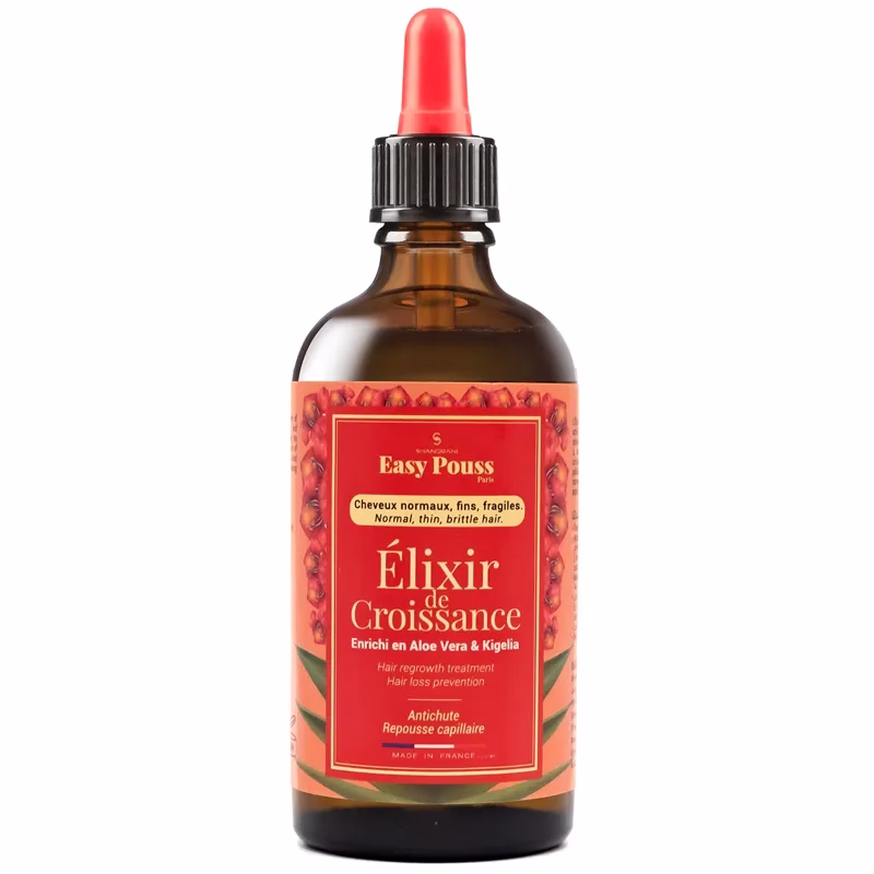 Anti-hair loss treatment designed for hair regrowth and damage control. Thanks to its highly concentrated formula with natural active ingredients, Elixir Easy Pouss prevents hair loss and accelerates hair growth considerably. Powerful formula improves hair thickness by allowing better blood flow to the scalp. It suppresses dandruff, strengthens the root, and allows incredible manageability of the hair while keeping it healthy. Main features of hair growth treatment: