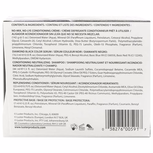 NoMix, NoLye Conditioning Relaxer Creme: Deionized Water (Aqua), Petrolatum, Cetearyl alcohol, propylene glycol, Lithium Hydroxide, Ceteareth20, DEAOleth10 Phosphate, Black Color Serum: Deionized Water (Aqua), PEG4, benzyl alcohol, Basic Blue 99 (C1 56059), Basic Red 76 (C1 12245), DMDM HYDANTOIN, Conditioning Neutralizing Shampoo: Deionized Water (Aqua), Sodium Laureth sulfate, Cocamidopropyl Betaine, Cocamide DEA, PPG5Ceteth10 Phosphate, PEG30 Glyceryl Cocoate, Olive Oil PEG7 Esters, Guar Hydroxypropyltrimonium Chloride, Citric Acid, Sodium Hydroxymethylglycinate, Glycol Stearate, Phenolsulfonphthalein, Replenishing Conditioner: Deionized Water (Aqua), Cetyl Alcohol, Dicetyldimonium Chloride, Acetamide MEA, PEG75 Lanolin, glyceryl Stearate, Cetrimonium Chloride, Polymethacrylamidopropyltrimonium Chloride, Tocopherol (Vitamin E), Polysorbate 65, PEG40 Castor Oil (PEG40 Ricinus Communis), MEthylparaben, propylparaben, Imidazolidinyl Urea, Protective Base: Petrolatum, Mineral Oil (Paraffinum Liquidum), PAraffin, Microcrystalline Wax (Cera Microcristallina), fragrance