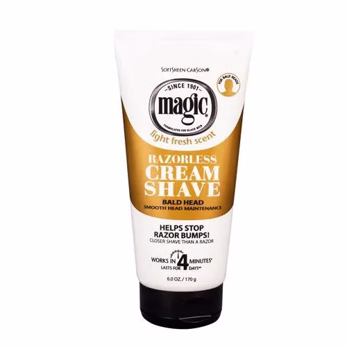 Magic Razorless Cream Shave formulated to help stop razor bumps and give a closer shave than a razor. With a light fresh scent. Works in 4 minutes and lasts for 4 days. Smooth Strength formula for soft beards.