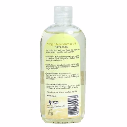 Macadamia Nut Oil Morimax Macadamia Nut Oil is a light yellow oil with a fine, nutty scent. The palmitoleic acid content is exceptionally high, as this fatty acid is otherwise only found in animal fats. Because of this high proportion of anti-inflammatory active ingredients, our Morimax macadamia nut oil is particularly recommended for sensitive, irritated or inflamed skin. But also a proven remedy for brittle hair, either as a hair pack or for the ends of the hair.Get our Morimax macadamia nut oil, because it is one of the most valuable skin oils.