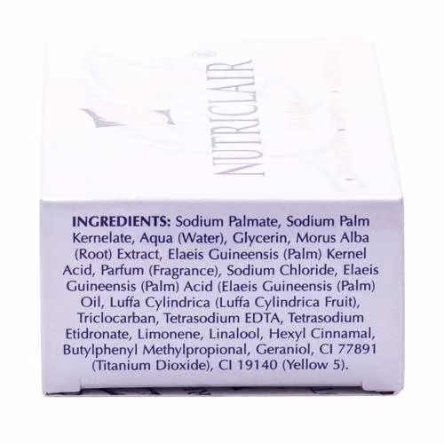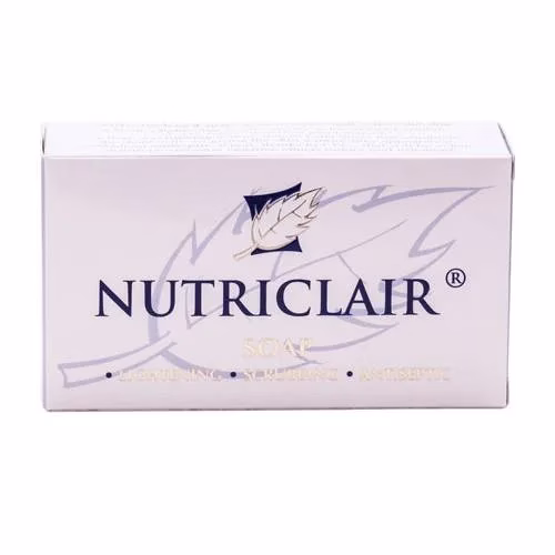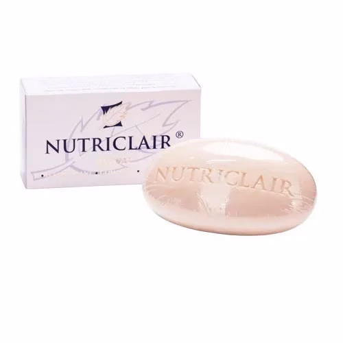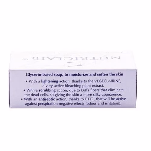 Nutriclair Lightening Scrubbing Antiseptic Soap. It is a glycerine based soap , to moisturze and soften the skin. With a lightening action, thanks to the vege clairine a very active bleaching plant extract. With scrubbing action, due to lu ffa fibers that eliminate the dead cells, so giving the skin a more silky appear ence.