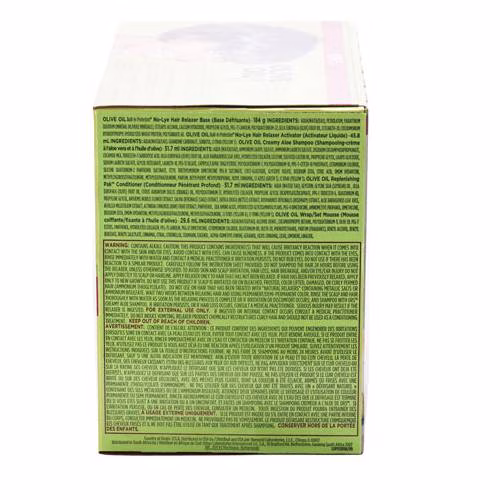 Olive Oil Built-in Protection No-lye Hair Relaxer Base Base Dfrisante – 184 G Ingredients Aqua, Petrolatum, Paraffinum Liquidum, Cetearyl Alcohol, Calcium Hydroxide, Propylene Glycol, Peg-75 Lanolin, Polyquaternium-22, Olea Europaea Olive Fruit Oil, Ceteareth-20, Cocodimonium Hydroxypropyl Hydrolyzed Wheat Protein, Polysorbate 60. Olive Oil Built-in Protection No-lye Hair Relaxer Activator Activateur Liquide – 45.8 Ml Ingredients Aqua, Guanidine Carbonate, Sorbitol, Ci 19140 Yellow 5. Olive Oil Creamy Aloe Shampoo Shampooing crème L’Aloe Vera Et L’huile D’olive – 51.7 Ml Ingredients Aqua, Ammonium Lauryl Sulfate, Ammonium Laureth Sulfate, Disodium Cocoamphodipropionate, Cocamide Mea, Trideceth-7 Carboxylic Acid, Olea Europaea Olive Fruit Oil, Aloe Barbadensis Leaf Juice, Hydrolyzed Collagen, Lecithin, Sulfated Castor Oil, Glycerin, Propylene Glycol, Lauryl Glucoside, Sodium Laureth Sulfate, Glycol Distearate, Laureth-10, Peg-12 Oleate, Capryliccapric Triglyceride, Polyquaternium-7, Polyquaternium-10, Ppg-5-ceteth-10 Phosphate, Cetrimonium Chloride, Silicone Quaternium-2 Panthenol Succinate, Cetyl Triethylmonium Dimethicone Peg-8 Succinate, Coco-glucoside, Glyceryl Oleate, Disodium EDTA, Citric Acid, DMDM Hydantoin, Methylchloroisothiazolinone, Methylisothiazolinone, Parfum, Butylphenyl Methylpropional, Hexyl Cinnamal, Ci 42053 Green 3, Ci 19140 Yellow 5. Olive Oil Replenishing Pak Conditioner Conditionneur Pntrant Profond – 51.7 Ml Ingredients Aqua, Polyquaternium-37, Glycine Soja Soybean Oil, Glycerin, Propylene Glycol Dicaprylatedicaprate, Olea Europaea Olive Fruit Oil, Citrus Aurantium Dulcis Orange Oil, Anthemis Nobilis Flower Extract, Salvia Officinalis Sage Extract, Urtica Dioica Nettle Extract, Rosmarinus Officinalis Rosemary Extract, Aloe Barbadensis Leaf Juice, Achillea Millefolium Extract, Actinidia Chinensis Kiwi Fruit Extract, Panthenol, Hydrolyzed Collagen, Silk Amino Acids, Hydrolyzed Glycosaminoglycans, Quaternium-80, Propylene Glycol, Peg-9 Dimethicone, Ppg-1 Trideceth-6, Aminomethyl Propanol, Dimethicone, Olive Oil Built-in Protection No-lye Hair Relaxer Base Base Dfrisante – 184 G: Aqua, Petrolatum, Paraffinum Liquidum, Cetearyl Alcohol, Calcium Hydroxide, Propylene Glycol, Peg-75 Lanolin, Polyquaternium-22, Olea Europaea Olive Fruit Oil, Ceteareth-20, Cocodimonium Hydroxypropyl Hydrolyzed Wheat Protein, Polysorbate 60 Olive Oil Built-in Protection No-lye Hair Relaxer Activator Activateur Liquide – 45.8 Ml: Aqua, Guanidine Carbonate, Sorbitol, Ci 19140 Yellow 5. Olive Oil Creamy Aloe Shampoo Shampooing crème L’Aloe Vera Et L’huile D’olive – 51.7 Ml: Aqua, Ammonium Lauryl Sulfate, Ammonium Laureth Sulfate, Disodium Cocoamphodipropionate, Cocamide Mea, Trideceth-7 Carboxylic Acid, Olea Europaea Olive Fruit Oil, Aloe Barbadensis Leaf Juice, Hydrolyzed Collagen, Lecithin, Sulfated Castor Oil, Glycerin, Propylene Glycol, Lauryl Glucoside, Sodium Laureth Sulfate, Glycol Distearate, Laureth-10, Peg-12 Oleate, Capryliccapric Triglyceride, Polyquaternium-7, Polyquaternium-10, Ppg-5-ceteth-10 Phosphate, Cetrimonium Chloride, Silicone Quaternium-2 Panthenol Succinate, Cetyl Triethylmonium Dimethicone Peg-8 Succinate, Coco-glucoside, Glyceryl Oleate, Disodium EDTA, Citric Acid, DMDM Hydantoin, Methylchloroisothiazolinone, Methylisothiazolinone, Parfum, Butylphenyl Methylpropional, Hexyl Cinnamal, Ci 42053 Green 3, Ci 19140 Yellow 5. Olive Oil Replenishing Pak Conditioner Conditionneur Pntrant Profond – 51.7 Ml: Aqua, Polyquaternium-37, Glycine Soja Soybean Oil, Glycerin, Propylene Glycol Dicaprylatedicaprate, Olea Europaea Olive Fruit Oil, Citrus Aurantium Dulcis Orange Oil, Anthemis Nobilis Flower Extract, Salvia Officinalis Sage Extract, Urtica Dioica Nettle Extract, Rosmarinus Officinalis Rosemary Extract, Aloe Barbadensis Leaf Juice, Achillea Millefolium Extract, Actinidia Chinensis Kiwi Fruit Extract, Panthenol, Hydrolyzed Collagen, Silk Amino Acids, Hydrolyzed Glycosaminoglycans, Quaternium-80, Propylene Glycol, Peg-9 Dimethicone, Ppg-1 Trideceth-6, Aminomethyl Propanol, Dimethicone, Disodium EDTA, Phenoxyethanol, Benzoic Acid, Ethylhexylglycerin, Glycereth-2 Cocoate, Ci 15985 Yellow 6, Ci 19140 Yellow 5. Olive Oil Incredibly Rich Oil Moisturizing Hair Lotion – 7.4 Ml: Aqua, Cocos Nucifera Coconut Oil, Carthamus Tinctorius Safflower Seed Oil, Ricinus Communis Castor Seed Oil, Petrolatum, Sorbitol, Cyclopentasiloxane, Cetearyl Alcohol, Dimethicone, Glyceryl Stearate Se, Ppg-3 Benzyl Ether Myristate, Olea Europaea Olive Fruit Oil, Carbomer, Sodium Cetearyl Sulfate, Stearic Acid, Aminomethyl Propanol, Disodium EDTA, BHT, Phenoxyethanol, Benzoic Acid, Ethylhexylglycerin, Glycereth-2 Cocoate, Parfum, Alpha-isomethyl Ionone, Benzyl Alcohol, Benzyl Salicylate, Butylphenyl Methylpropional, Geraniol, Hexyl Cinnamal, Hydroxyisohexyl 3-cyclohexene Carboxaldehyde, Limonene, Linalool, Ci 42090 Blue 1, Ci 19140 Yellow 5. Olive Oil Wrapset Mousse Mousse Coiffantefixante L’huile D’olive – 29.6 Ml: Aqua, Cocamidopropyl Betaine, Polyquaternium-11, Olea Europaea Olive Fruit Oil, Panthenol, Hydrolyzed Collagen, Peg-75 Lanolin, Peg-12 Dimethicone, Cetrimonium Chloride, Quaternium-80, Oleth-20, Propylene Glycol, Phenoxyethanol, Benzoic Acid, Ethylhexylglycerin, Glycereth-2 Cocoate, Parfum, Alpha-isomethyl Ionone, Benzyl Alcohol, Benzyl Salicylate, Butylphenyl Methylpropional, Hexyl Cinnamal, Limonene, Linalool