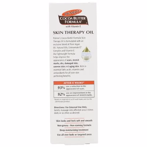 Cocoa Butter Formula Skin Therapy Oil is an advanced multi-purpose skin perfection product that can be used all over the body. This preservative-free, lightweight formula contains an exclusive blend of key ingredients designed to improve the appearance of scars, stretch marks, dry, damaged skin, uneven skin tone, aging skin, and fine lines and wrinkles. With this unique, non-greasy, non-staining formula, skin looks and feels instantly soft and supple.
