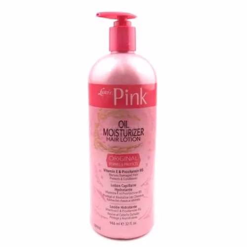 Pink Oil Moisturizer Lotion protects your hair against breakage and split ends. Pink Oil Moisturizer Hair Lo tion with rich natural conditioners, Panthenol B5, vitamins and sunscreen helps guard against the damaging effects of hot combs, curling irons and sun exposure. Use it every time you blow dry to restore nutrients and moisturize. Great for r elaxed and specialty styles, curls and body waves.