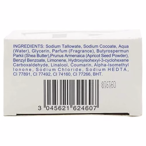Sodium Tallowate (AND/OR) Sodium Palmate, Aqua (Water), Sodium Cocoate (AND/OR) Sodium Palm Kernelate, Glycerin, Parfum (Fragrance), Butyrospermum Parkii (Shea) Butter, Prunus Armeniaca (Apricot) Seed Powder, Benzyl Benzoate, Limonene, Hydroxyisohexyl-3-Cyclohexene Carboxaldehyde, Linalool, Coumarin, Alpha-Isomethyl Ionone, Sodium Chloride, Trisodium HEDTA, Sodium Hydroxide, CI 77891, CI 74160, BHT.