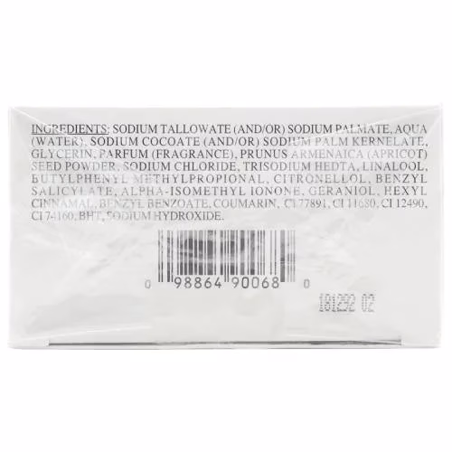 Sodium Tallowate (And / Or) Sodium Palmate, Aqua (Water), Sodium Cocoate (And / Or) Sodium Palm Kernelate, Glycerin, Parfum (Fragrance), Prunus Armeniaca (Apricot) Seed Powder, Sodium Chloride, Trisodium EDTA, Linalool, Butylphenyl Methylpropional, Citronellol, Benzyl Salicylate, Alpha-Isomethyl Ionone, Geraniol, Hexyl Cinnamal, Benzyl Benzoate, Coumarin, CI 77891, CI 11680, CI 12490, CI 74160, BHT, Sodium Hydroxide.