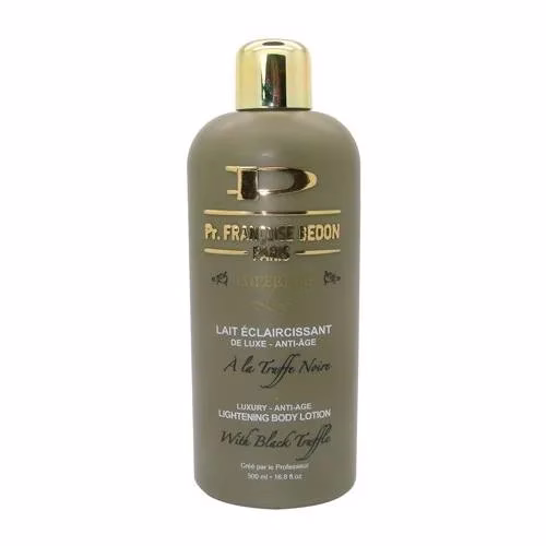 Professor Francoise Bedon IMPERIALE LUXE body lotion with black truffle, specially adapted to black and half-box skins, is carried out through its 100% natural active ingredients. This formula treats and helps remove scars and blemishes caused by pregnancy, age, or sun exposure. Thanks to the anti-aging virtues of the black truffle, it is a daily strong youth actor for your skin. For exceptional effectiveness, first wash your skin with Professor Francoise Bedon IMPERIALE Soap and then apply IMPERIALE Body Lotion, which you mix with Lightening IMPERIALE Serum. Apply once or twice a day, insisting on your hands, elbows and knees.