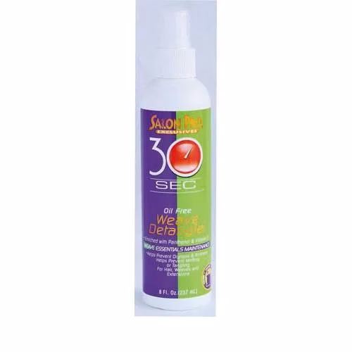 Salon Pro 30 Sec Weave Detangler enriched with Panthernol and Vitamin E, oil- free featherlight spray which can be used either as a detangler or leave-in conditioner to help soften and condition your hair as it prevents matting and tangling of your weave and extensions. This conditioning spray helps to prolong your w eave or extensions by bringing any overworked drooping weave back to life.