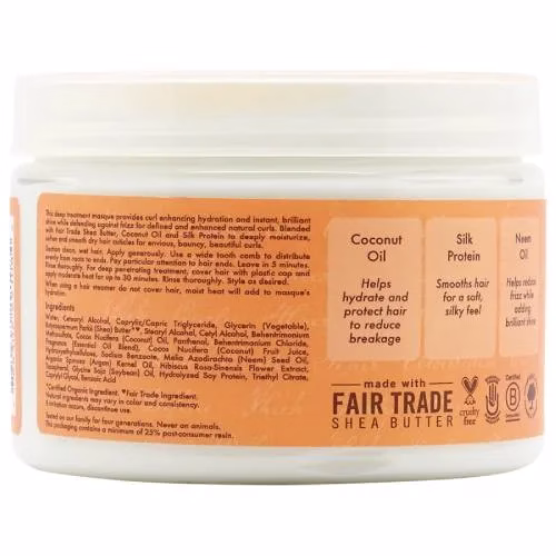 This deep treatment mask provides nourishing moisture and instant, brilliant shine while protecting against frizz for defined and enhanced natural curls. Mixed with fair trade & organic shea butter, coconut oil and silk protein to deeply moisturize, soften and smooth dry hair cuticles, for envious, springy, beautiful curls.