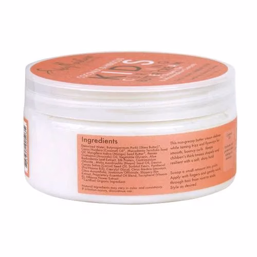 Coconut Oil blended into the nourishing formula of SheaMoisture’s Coconut & Hibiscus Kids Curling Butter Cream provides intens e moisturization while adding definition to dry, sensitive curls. Hibiscus Flowe r Extracts add volume to curls and impart a brilliant shine while slippery Elm E xtract soothes and smooths sensitive locks. Certified Organic Shea Butter used in this moisturizing formula nourishes every strand to leave your child with heal thy, bouncy and adorably defined curls!