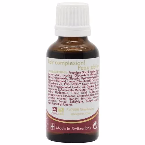 Propylene Glycol, Water (Aqua), Ascorbic Acid, Licorice (Glycyrrhiza Glabra) Root Extract, Niacinamide, Glycerin, Hydroxyethylcellulose, Fragrance (Parfum), Limon (Citrus Limon) Fruit Extract, Polysorbate 20, PPG-1-PEG-9 Lauryl Glycol Ether, PEG-40 Hydrogenated Castor Oil, Sodium Bisulfite, Matricaria (Chamomilla Recutita) Flower Extract, DMDM Hydantoin, Citric Acid, Iodopropynyl, Butylcarbamate, Limonene, Citronellol, Linalool, Citral, Cinnamyl Alcohol, Benzyl Benzoate, Geraniol, Coumarin, Benzylate , Benzyl Alcohol, Alpha-Isomethyl Ionone.