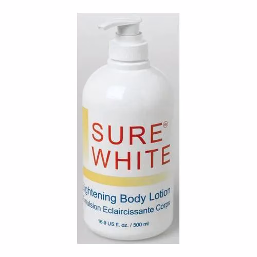 Brightening and moisturizing body emulsion consisting of interacting ingredients. This nourishing and finely perfumed emulsion combats the formation of new pigment spots on the skin of your body without irritating the skin. With regular use of the Sure White body lotion, your skin will stay healthy and the body lotion will give the skin a clearer, softer and smoother appearance. The lotion is particularly suitable for alleviating hyperpigmentation spots, scars, pregnancy marks and other signs of premature aging. The body lotion also helps soothe freckles caused by exposure to strong sunlight.