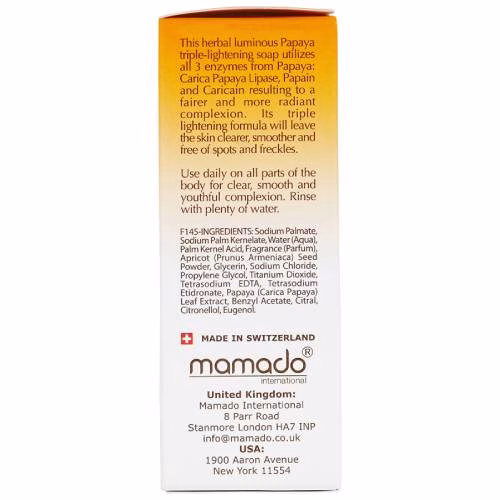 Swiss Soft n White Papaya Lightening Soap is enriched with vitamin E. This triple lightening herbal papaya soap uses all 3 of Pa Paya’s enzymes, namely Alkalid Ca-Pain, Cericin and Papain, resulting in lighter and more radiant skin. The triple lightening formula and vitamin E make the skin clearer and smoother from blemishes and freckles. Use daily on all parts of the body for a clear, smooth and youthful complexion.