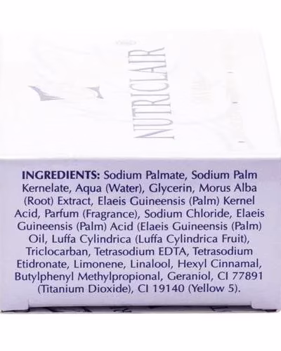 Nutriclair Lightening Scrubbing Antiseptic Soap. It is a glycerine based soap , to moisturze and soften the skin. With a lightening action, thanks to the vege clairine a very active bleaching plant extract. With scrubbing action, due to lu ffa fibers that eliminate the dead cells, so giving the skin a more silky appear ence.